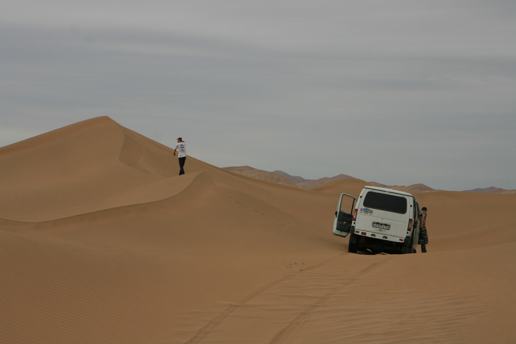 Самое интересное нас ждало в районе Алашань-Юци. Затяжная езда по песчаным дюнам имеет свою технологию — тупо валить по проложенному компьютером курсу не получится — сразу застрянешь. У нас есть отработанный алгоритм — забраться на самую большую дюну и с нее осматривать близлежащие дюны на предмет оптимального маршрута. Как при блужданиях в тайге залезть на самое высокое дерево. Это занятие дарит ни с чем несравнимые эстетические ощущения и позволяет лишний раз убедиться, что человек вовсе не царь природы — как он мелок и жалок вместе со своим авто, пусть и подготовленным. Главное, не бояться застрять. Конечно, ты обязательно где-то застрянешь, но с полным приводом, понижайкой, двумя блокировками и правильными колесами это не страшно. Плюс лопата и набор сенд-траков. Для песка лучше всего подходят синтетические, но и алюминиевые лучше иметь с собой. Компрессоров лучше возить пару — в пустыне они перегреваются раньше, чем успеваешь накачать все четыре колеса. А вот комплект тросов нужен только для спасения тех, у кого нет «Соболя». В нашем случае это были китайские болельщики на кросоверах.