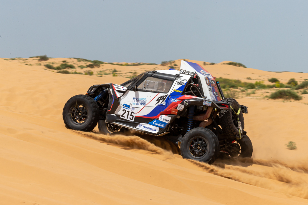 — Песков больших не видел, но наш любимый астраханский бархан «Большой брат» был, поэтому можно сказать, что самое сложное проехали, — поделился впечатлениями именитый гонщик. — У нас была сегодня остановка на бездорожье. Там ступенька такая, что машину аж заклинило. Оказалось — автоматически «встала в ручник»! Вышел, посмотрел — все нормально. Думал, колеса отлетели, но нет — целые. Сел — не едет. За ручник подергал — тронулся. Странная история вообще. Сегодня спецучасток быстрее, чем вчера, но на нем хватало жестких мест, а мы же ехали «открывашкой». Кое-где шли прямо по траве: дорожка заросла и ее просто не видно. В целом же все хорошо, финиш есть…