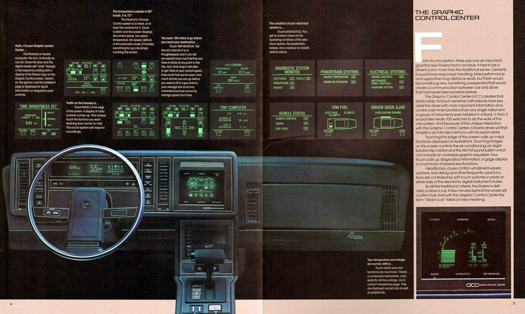 Как и в случае с Aston Martin, Buick Riviera 1986 года стал чем-то вроде иллюстрации к фантастическому фильму или книге, когда провидцы-фантасты описывают технологию будущего, представляя ее реализацию современными им техническими средствами. Buick Riviera стал первым в мире серийным автомобилем с сенсорным экраном управления. С помощью сенсорного экрана все той же электронно-лучевой трубки, в автомобиле контролировалось большинство его систем . Устройство работало довольно успешно, о чем вы можете судить взглянув на видеоролик внизу. Но потребовалось не менее 20 лет, чтобы технология стала пригодной к массовому применению и не доставляла хлопот.