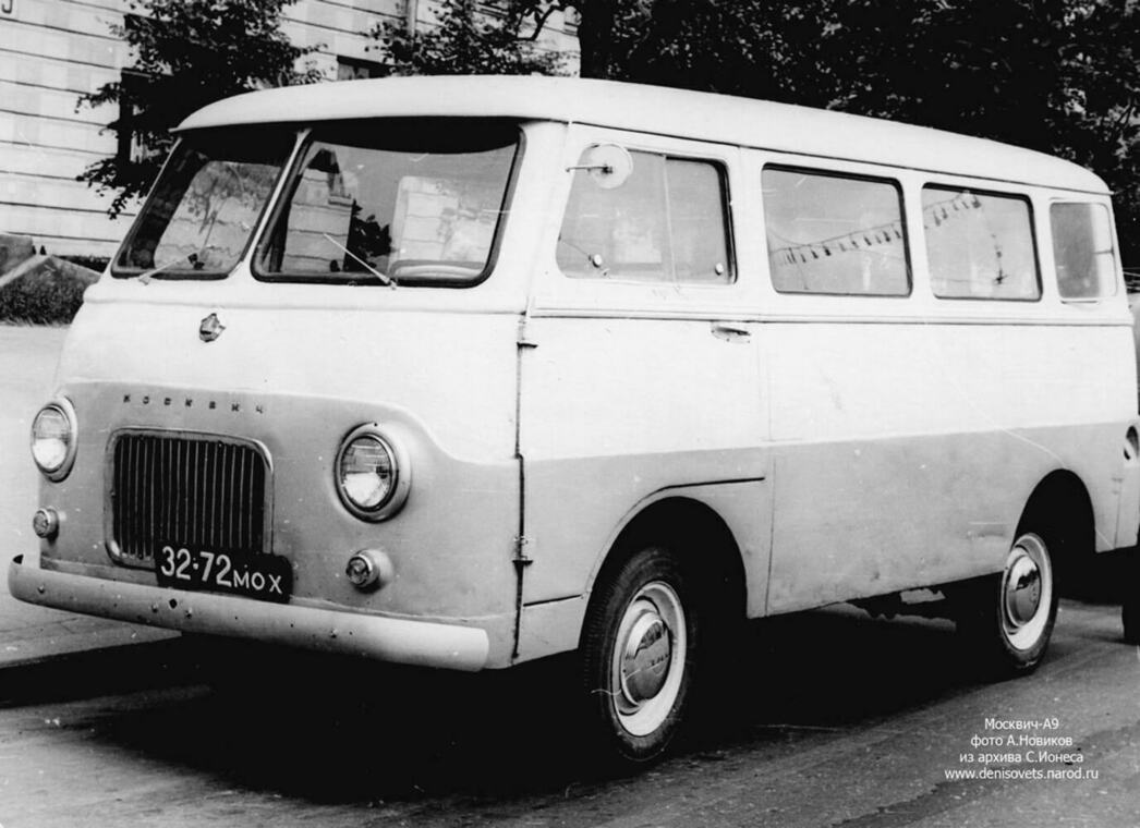 В 1957 году до СССР добралась западная мода на микроавтобусы. И снова под руководством начальника экспериментального цеха И. А. Гладилина и специалиста в области автомобильных подвесок В. И. Евланова начались поиски отечественного ответа Америке и Европе, результатом которых стало появление на свет девятиместного опытного образца «Москвича-А9». Шины от ГАЗ−21, задний мост от «Москвича−401», детали ходовой от 402-го. В него также были установлены верхнеклапанный двигатель модели «407» и 4-ступенчатая коробка передач, на минуточку, от гоночного «Москвича» — Г1—405.