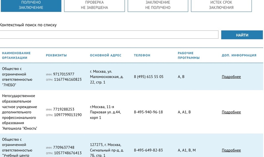 Если говорить о Москве, то в подразделе «Получено заключение» он найдет всего три автошколы, а все оставшиеся (без малого 300 автокурсов) помещены в черный список под названием «Заключение не получено».