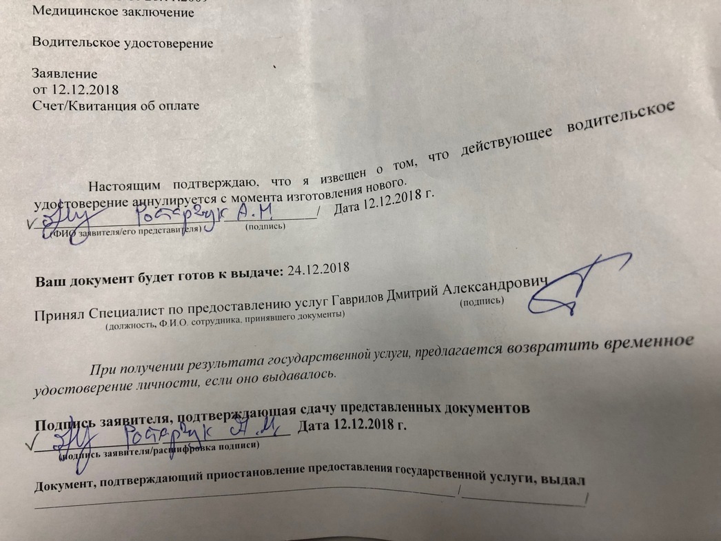 Дело в том, что сегодня МФЦ не оформляет в/у, выступая в данном случае исключительно в роли «почтового отделения», принимающего у граждан «корреспонденцию» в виде необходимых бумаг и отсылающего ее в Госавтоинспекцию, где, собственно, «права» как «печатали», так и «печатают». И в определенный момент, поясняют сотрудники МФЦ, инспектор удаляет номер старого удостоверения из гаишной базы и вносит в нее данные нового. И с этого момента старое удостоверение в точном соответствии с постановлением Правительства РФ N 1097 «О допуске к управлению транспортными средствами» считается недействительным и подлежит аннулированию если выдано новое. Но поскольку человек последнего еще не получил, хотя формально оно и выдано, то по логике чиновников управляет машиной без «прав» со всеми описанными выше последствиями.