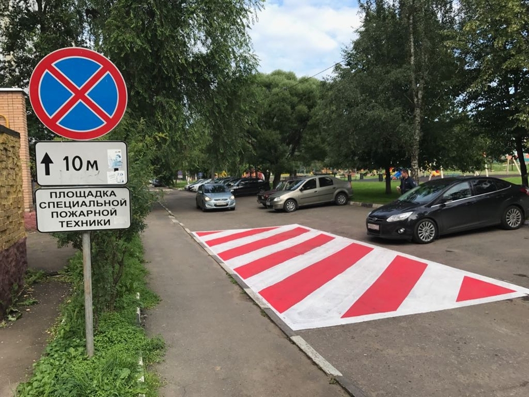 Красно-белых чередующихся полосок горизонтальной разметки в Правилах не предусмотрено. Поэтому для водителя ее, по большому счету, не существует, а значит никаких указаний в смысле ограничения парковки она не дает. Из вышесказанного может сложиться впечатление, что пожарной технике никаких преференций в жилой зоне не полагается. Это не так. На самом деле места для ее стоянки тут предусмотрены.
