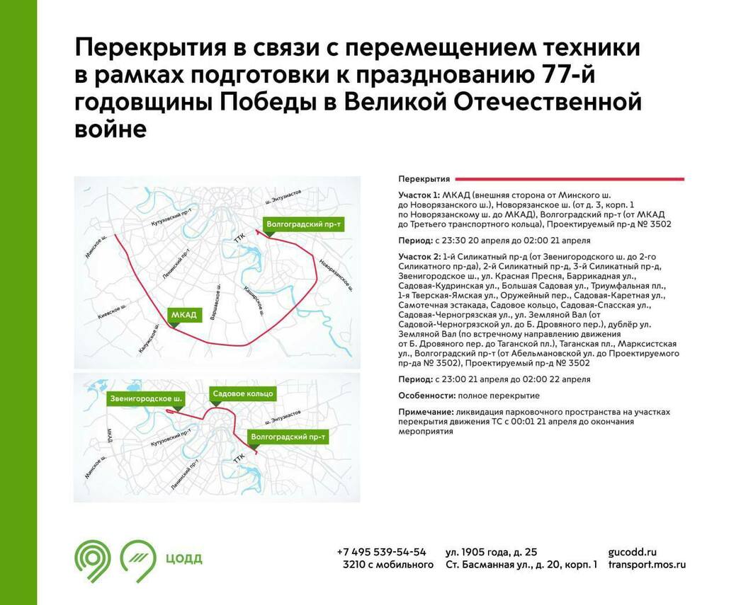 Прекращается движение транспорта 21—22 апреля с 23:00 до 02:00 часов: по 1-ому Силикатному проезду от Звенигородского шоссе до 2-го Силикатного проезда, по 2-ому Силикатный проезду, по 3-ому Силикатный проезду, по Звенигородскому шоссе, по улице Красная Пресня, по улице Баррикадная, по улице Садовая-Кудринская, по улице Большая Садовая, по Триумфальной площади, по улице 1-ая Тверская-Ямская, по Оружейному переулку, по улице Садовая-Каретная, по Самотечная эстакада, по улице Садовая-Спасская, по улице Садовая-Черногрязская, по улице Земляной Вал от улице Садовой-Черногрязской до Большого Дровяного переулка, по дублеру Земляного Вала от Большого Дровяного переулка до Таганской площади, по Таганской площади, по улице Марксистская, по Волгоградскому проспекту от улицы Абельмановской до Проектируемого проезда № 3502.