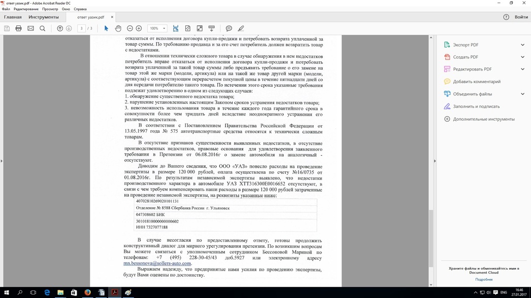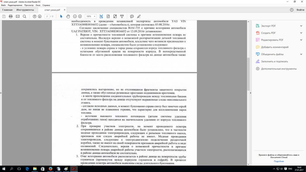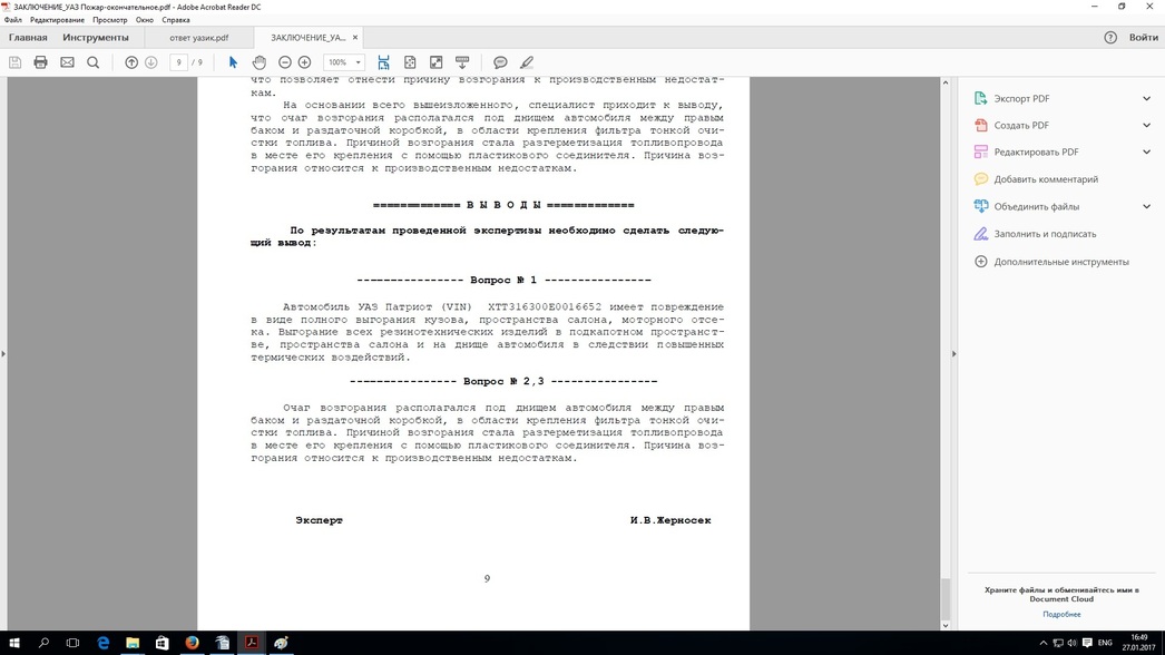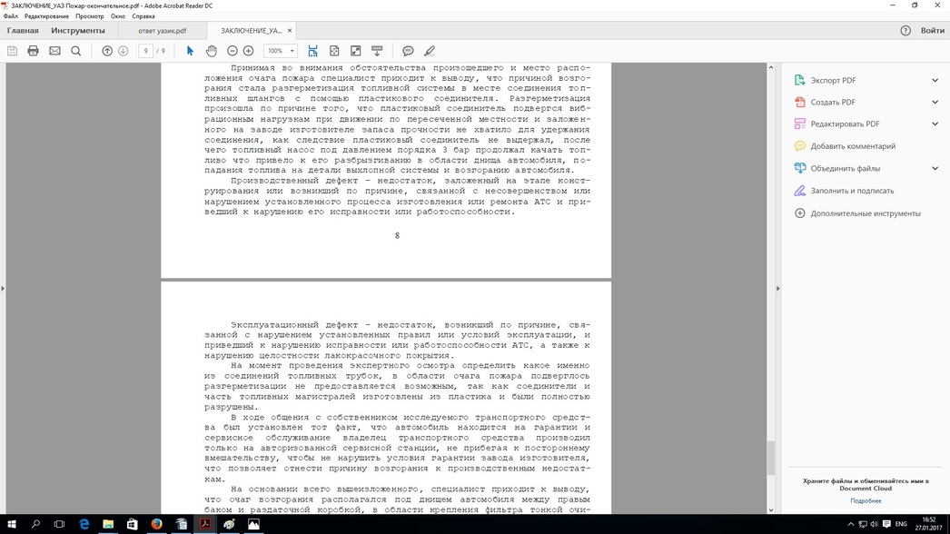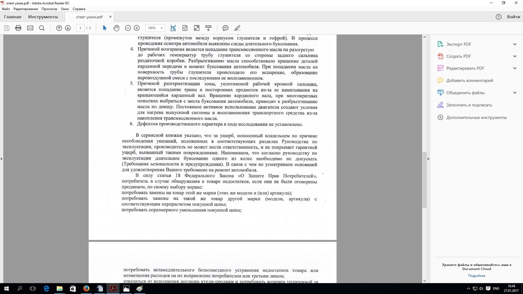 Тогда Алексей обратился в представительство UAZ Sollers, после чего производитель тут же инициировал еще одну независимую экспертизу, на основании выводов которой отказал в удовлетворении претензии. Ибо заключение гласило: «Причиной возгорания является попадание трансмиссионного масла на разогретую трубу глушителя вследствие разгерметизации полости раздаточной трансмиссии. Разбрызгиванию масла способствовало вращение деталей карданной передачи в момент буксования транспортного средства… и никаких недостатков производственного характера в автомобиле выявлено не было».