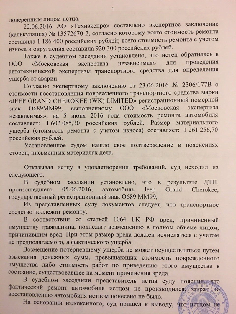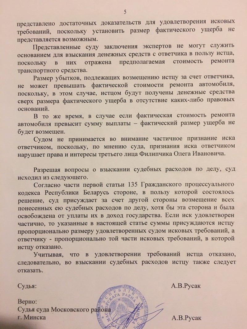 Туда и отправилась водительница разбитого «джипа» в августе 2016-го, чтобы отсудить 840 000 рублей — разницу между независимой оценкой повреждений и фактически выплаченной в рамках ОСАГО суммой. Помимо затрат на проживание и услуги местного адвоката, пришлось внести в белорусскую казну 5% от суммы иска. Слушание дела состоялось 17 ноября 2016. Результатом стал полный отказ в удовлетворении требований российского автовладельца, поскольку экспертиза, как решило белорусское правосудие, насчитала «предполагаемый», а не реальный ущерб. И, по мнению судьи, взыскание рассчитанной экспертами суммы с ООО «Белтрансвейс» может привести к незаконному обогащению Олейниковой Е.