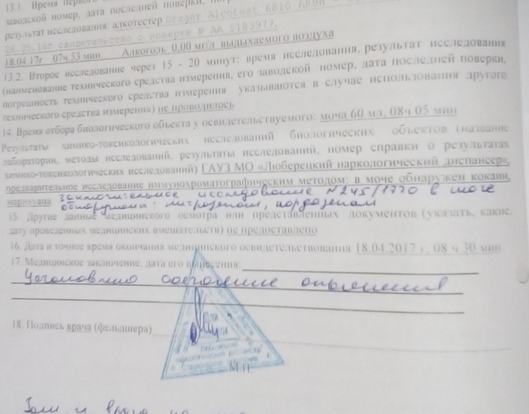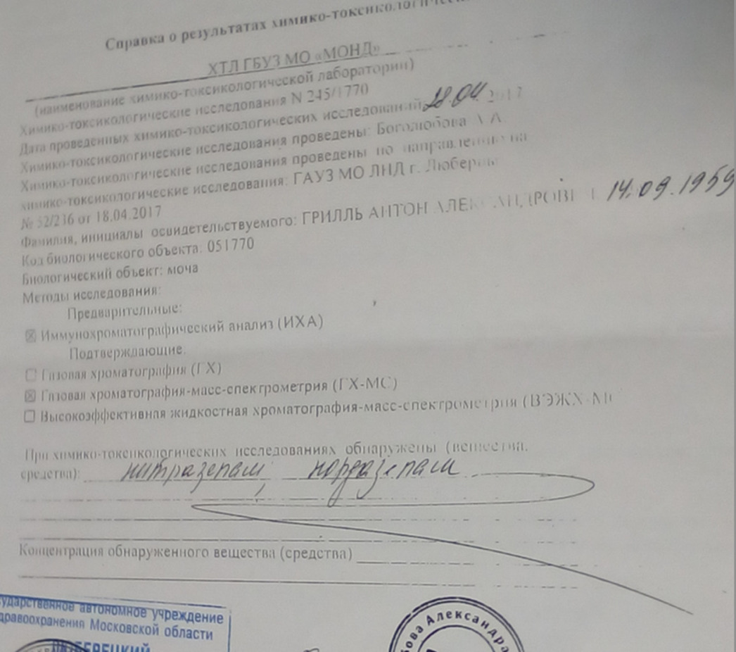 По крайней мере, так ему заявили наркологи. Однако согласно приказу Минздрава №933н, на этом этапе медосвидетельствования положено использовать не просто тесты, а тесты со специальными приборами для оценки результата — и не просто результата, а количественного. Но в нашем случае о концентрации обнаруженных веществ и слова сказано не было! Тем не менее, результаты этой «экспертизы» стали основанием для направления биоматериала «подозреваемого» в химико-токсикологическую лабораторию ГБУ «Московский областной наркологический диспансер» (ну как тут не вспомнить дело «пьяного мальчика», кровь которого «изучали» другие подмосковные доктора — из Бюро судебно-медицинской экспертизы МО). И ее результаты не заставили себя долго ждать.