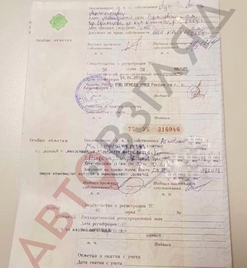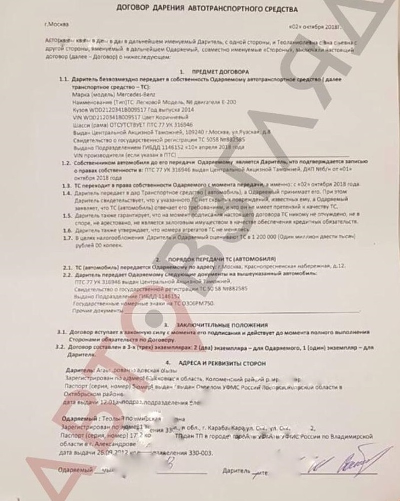 Противозаконного тут ничего нет, но определенно наводит на мысли, что они наверняка и хотели, да только гаишники не допустили. Хорошо, что еще не привлекли к ответственности. А то ведь мог вспыхнуть и другого рода скандал: например, Агаеву Сону — пиарщицу вроде бы даже певицы Ольги Бузовой взяли на попытке зарегистрировать в ГАИ «левый» Mercedes-Benz. Да, именно она является последним собственником авто, которая и передала его той самой Любови Теолани из Владимирской области на основании договора дарения.