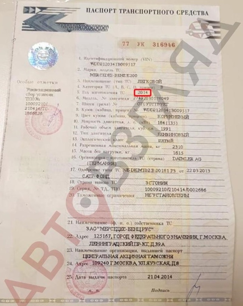 В распоряжении портала «АвтоВзгляд» оказался ПТС пресловутого «Мерседеса», в котором вписано не два, а целых четыре владельца. Более того: «немец» оказался не 2014 года рождения, а на пару лет старше. Во всяком случае, русским по-зеленому в ПТС изложено, что год изготовления транспортного средства — 2014, но первый владелец автомобиля в лице дилерского центра «Рольф» почему-то записан двумя годами ранее — 20 декабря 2012 года!