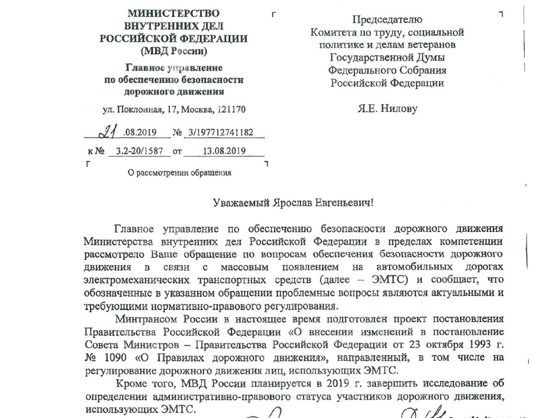 И, что любопытно, главный автоинспектор страны согласился с депутатом, признав, что «обозначенный в обращении проблемные вопросы являются актуальными и требующими нормативно-правового регулирования», в связи с чем «МВД России планирует в 2019 году завершить исследование об определении административно-правового статуса участников дорожно движения, использующих электромеханические транспортные средства (ЭМТС)».