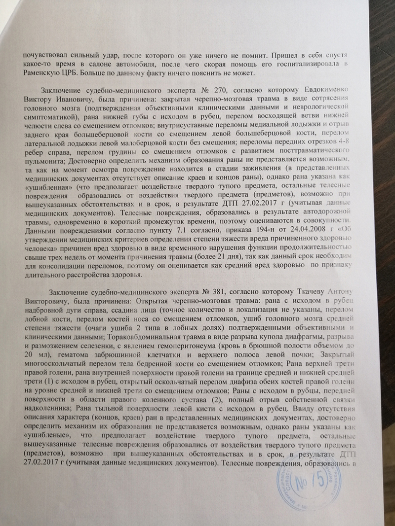 И снова был подан гражданский иск в его адрес в Раменский городской суд. Но в ходе одного из заседаний неожиданно выяснилось, что Ткачев Антон Викторович подал встречный гражданский иск против Виктора Евдокименко — на основании еще одного постановления раменской прокуратуры. В нем она чудесным образом отменила результаты уже повторной экспертизы и внезапно постановила, что достоверно установить обстоятельства и причины происшествия не представляется возможным!