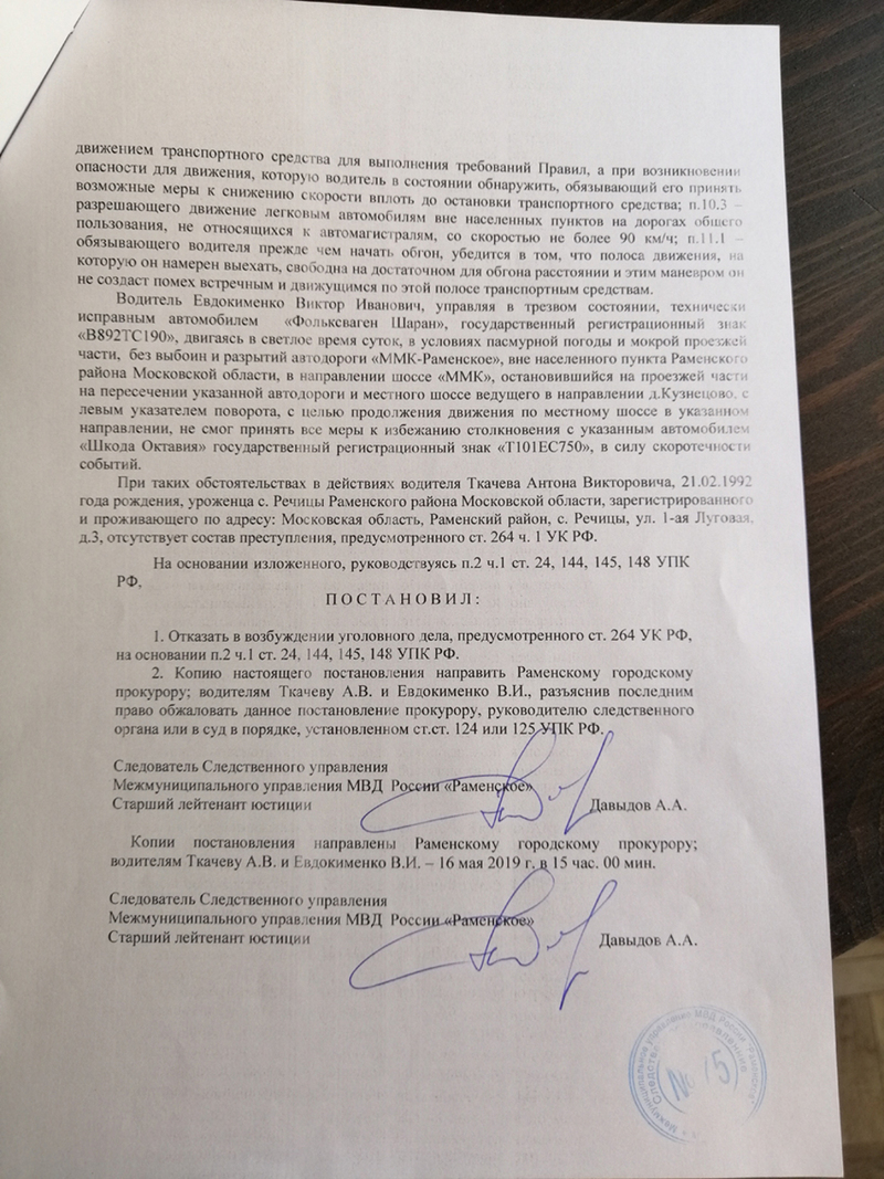 Но на нем внезапно выяснилось, что прокуратура города Раменское еще 17 сентября того же года… отменила постановление, в котором гражданин Ткачев был назван виновником аварии и отправила дело на повторное расследование.
