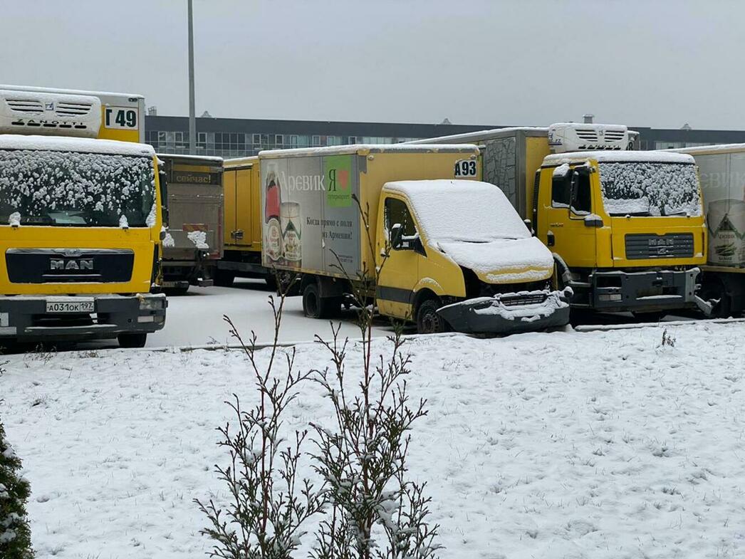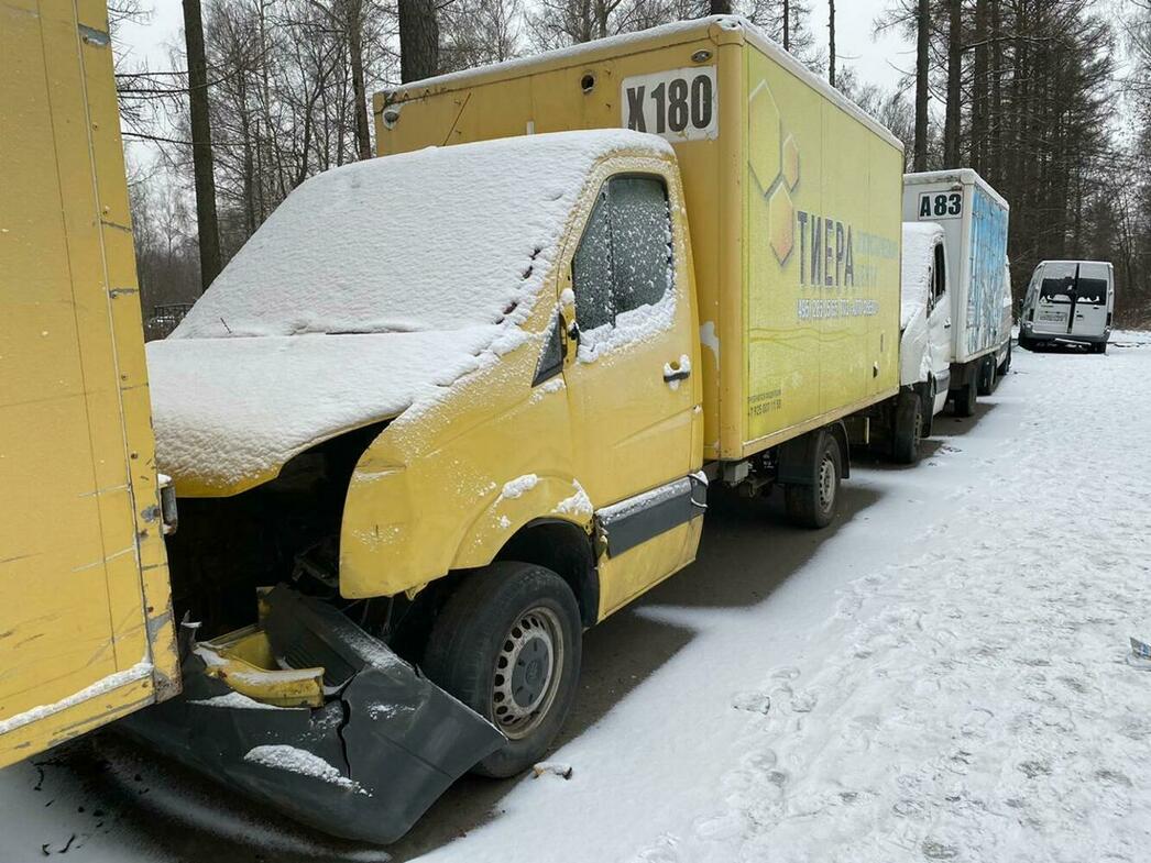 В отстойнике собраны разбитые и уже частично разобранные MAN, Volkswagen Crafter и Caddy, Hyundai Porter, Ford Transit, а также автобус ЛиАЗ.
