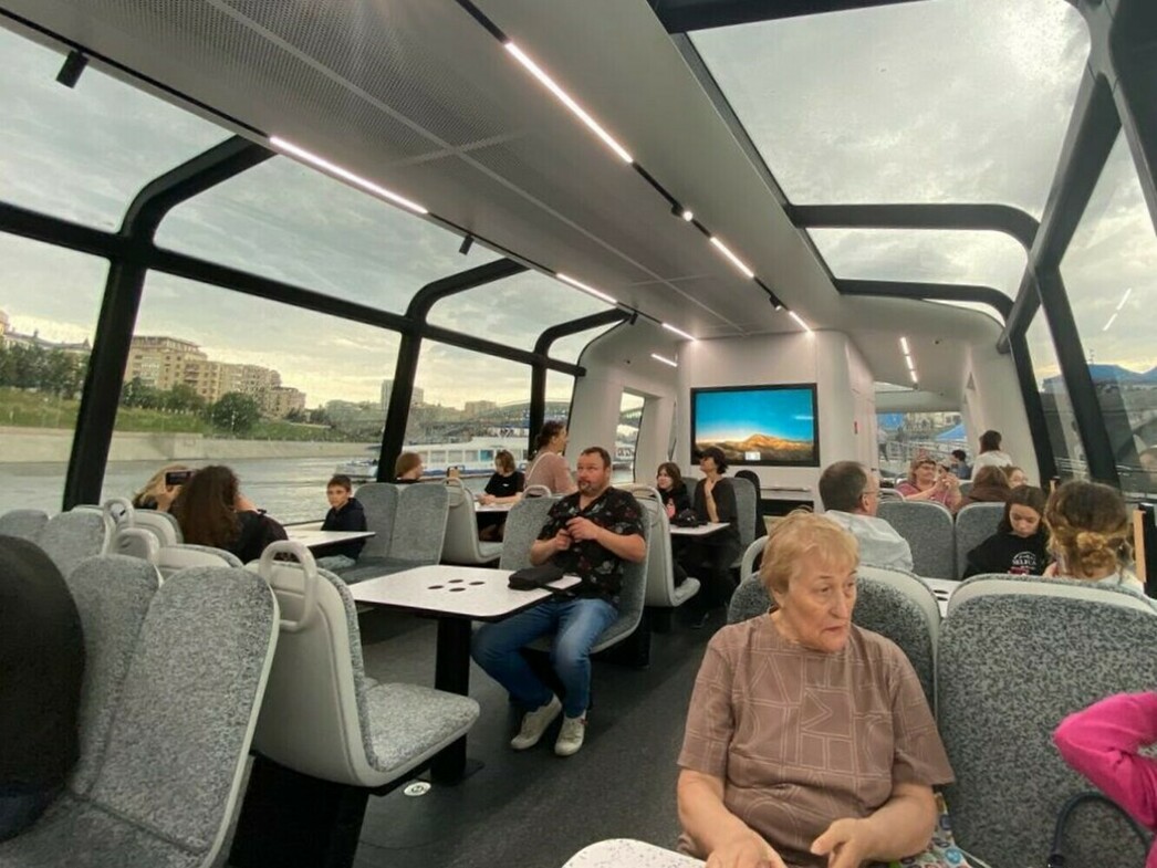 Пройдя через турникет, ты будто попадаешь в космический корабль на воде. Современный дизайн, открытая палуба и шикарные панорамные окна почти заставляют забыть о всех мучениях по пути сюда. Отдельно стоит отметить идею запускать на корабль строго по 30 человек. Люди не едут стоя, не набиваются как шпроты в банку, а удобно усаживаются в кресла и наблюдают за проносящимися высотками.