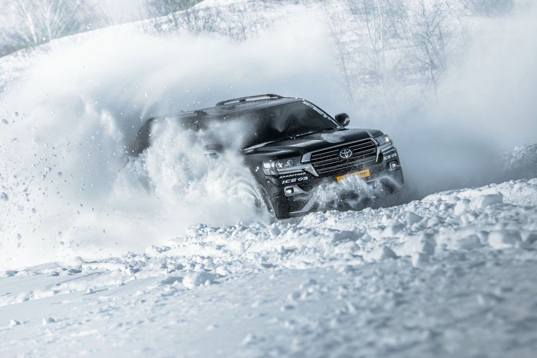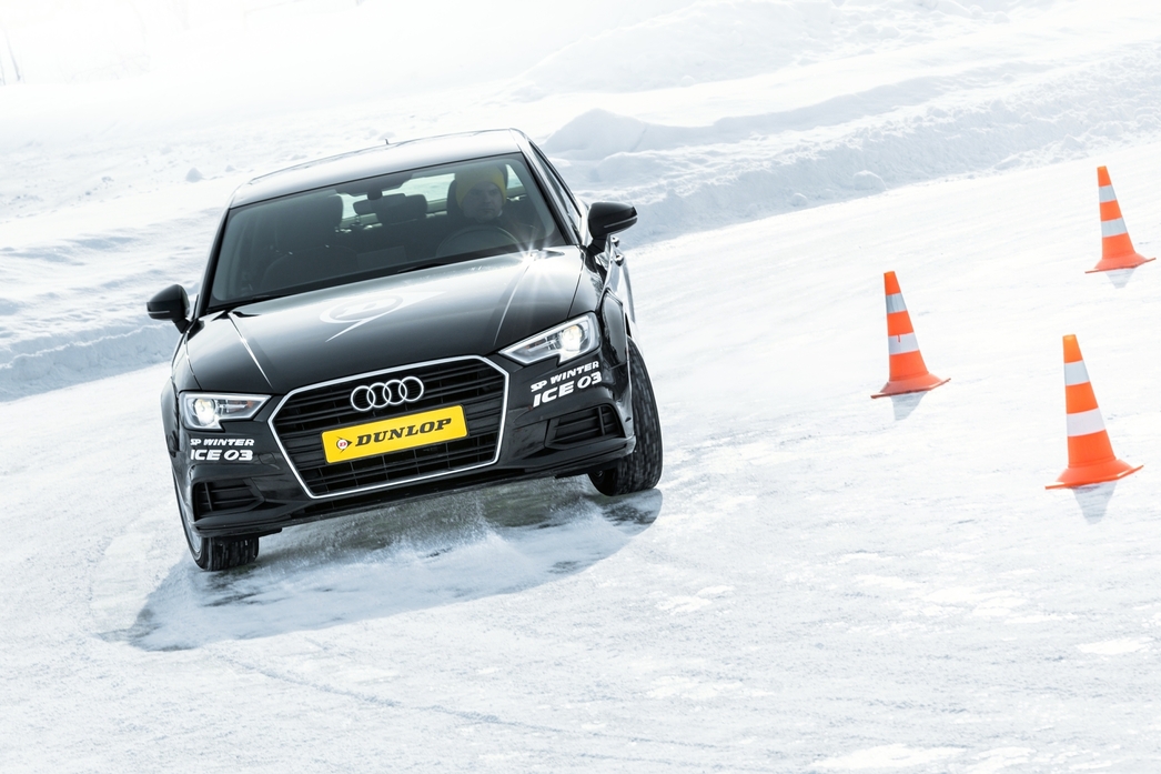 На тесте были представлены две модификации: покрышки для легковушек Dunlop SP Winter ICE 03, установленные на Audi A3, и «обувка» для кроссоверов и внедорожников Dunlop Grandtrek ICE 03, которой были укомплектованы Toyota Land Cruiser 200. Испытания проходили на огромной ледовой трассе, где вдоволь можно было поюзать резину на различных скоростях и типах покрытия.
