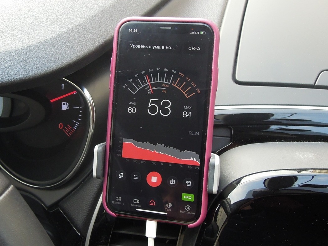 Испытания состояли из пяти заездов по не сильно загруженной трафиком асфальтированной дороге на скоростях 60 км/ч и 90 км/ч. Далее выводилась средняя арифметическая величина уровня шума в децибелах для каждой из скоростей. В итоге, мы получили уровень шума в салоне на уровне 53 дБ при 60 км/ч и 66 дБ при для 90 км/ч. В сети довольно много подобных тестов, поэтому читатель может сам оценить их. С учетом, что дорога была не абсолютно пустая от машин.