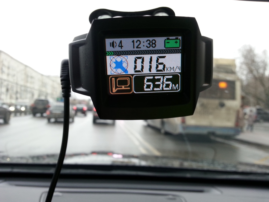 Для сигнализации о работающей впереди камере вполне хватит лишь звукового сигнала. Если захочется подробностей, достаточно бросить взгляд на монитор. Там тебе покажут и тип камеры, и расстояние до нее в метрах, и, если включен режим индикации сигнала полицейского радара, еще и «пеньки» уровня интенсивности облучения твоей машины. Именно в упомянутом выше режиме «приоритет радара», детектор раскрывает хозяину максимум информации о каждой встречной камере. Во первых, сразу становится ясно, включена ли она в данный момент: если на экране мигает название типа камеры и расстояние до нее, а индикации уровня радиосигнала нет, значит комплекс автоматической фиксации на самом деле выключен. А когда на экран выводятся и «пеньки» сигнала, и тип комплекса автоматической фиксации, и дистанция до нее – камера впереди по курсу активна.