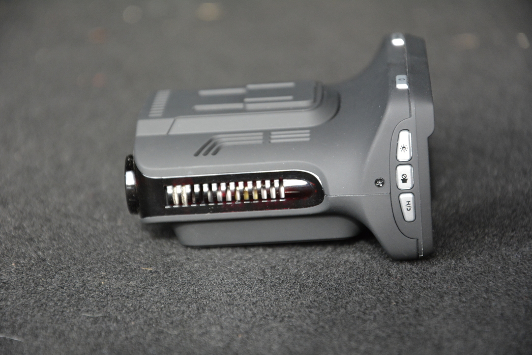 Когда дело дошло до Neoline x-cop 9700, стало ясно, что по сравнению с ним все его конкуренты в этом тесте — компактные малыши. Г-образный дизайн большого корпуса, как говорится, внушает! Видимо, его сделали таким, чтобы как-то разместить большой тач-скрин, на который выводится и видеосигнал с камеры устройства, и данные «антирадара», и «кнопки» меню настроек.