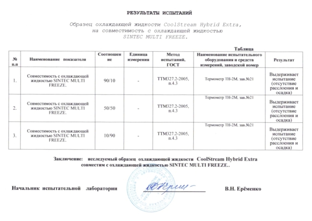 Лабораторные испытания показали, что Мультифриз от Sintec можно применять на любых типах бензиновых и дизельных двигателей. Тесты подтвердили неагрессивность Sintec Multifreeze к внутренним частям двигателя, изготовленным из любых применяемых сегодня материалов (алюминий, кремний, медь, латунь, магний, чугун) при смешивании с любым типом ОЖ. Результаты испытаний — в таблице.
