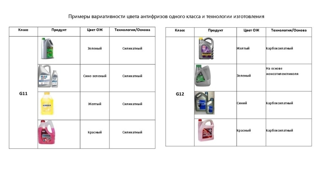Антифризы одного цвета могут быть разными по технологии изготовления и при смешении давать химические реакции типа хлопьев, пено- или газообразования — из-за спорящих друг с другом присадок. Антифризы одного класса могут быть разного цвета и вдобавок не иметь на этикетке подписи G11 или G12: там может быть указана температура застывания, технология или основа ОЖ — «Лобридный антифриз» или «ОЖ на основе моноэтиленгликоля».