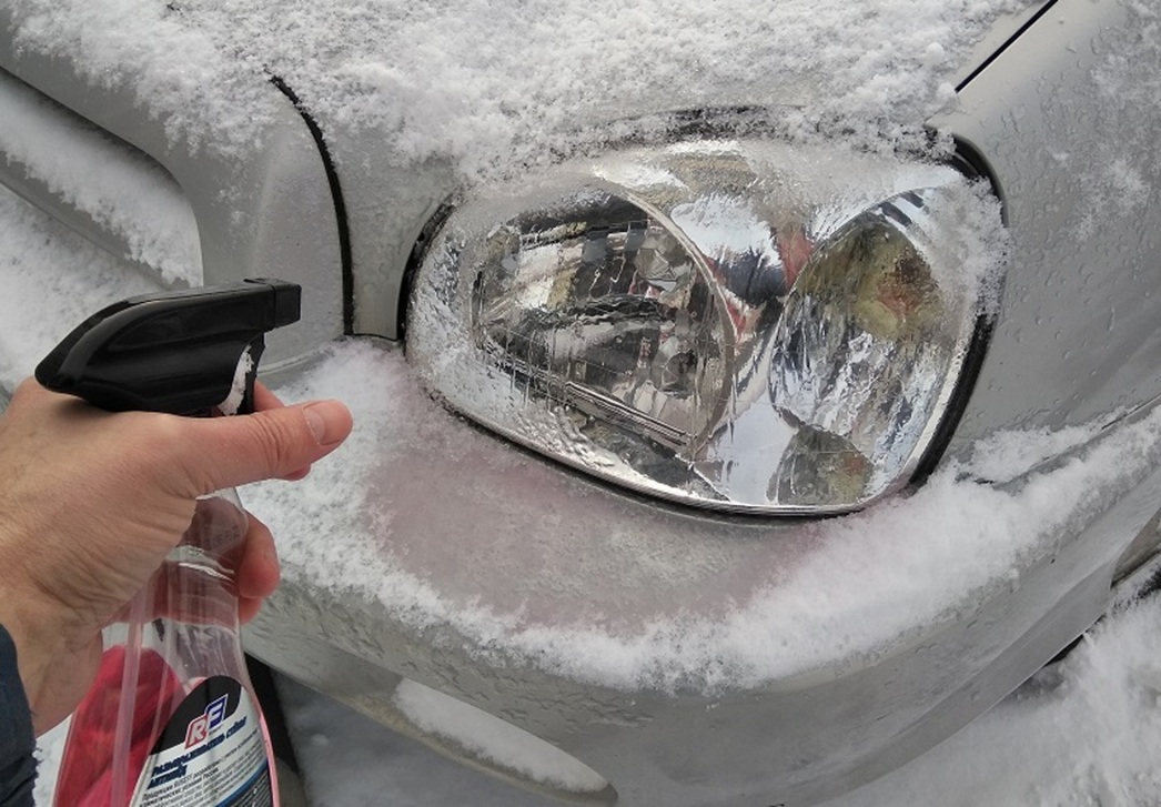 Это средство, которое поставляется на наш рынок в пластиковых флаконах с удобным «пистолетным» распылителем, специально разработано для удаления инея или льда со стекол, наружных зеркал и фар автомобиля. Обработав таким препаратом замерзшие стекла, можно быть уверенным, что лед с них будет удален очень быстро.