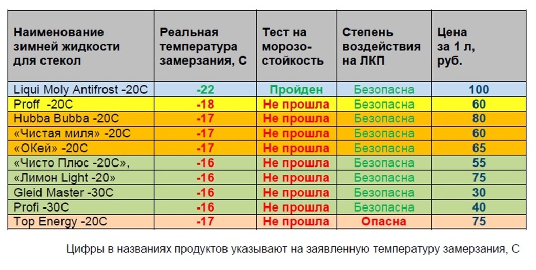 У остальных участников, проваливших тест на морозостойкость, расклад по температуре замерзания оказался таким: у «Чисто Плюс −20С», «Лимон Light −20», Profi −30C и Gleid Master реальный показатель зафиксирован на уровне −16 С, у Top Energy −20С, Hubba Bubba −20C, «ОКей −20 С» и «Чистя миля −20С» — на уровне −17С и, наконец, на отметке −18 градусов — у Proff −20С.