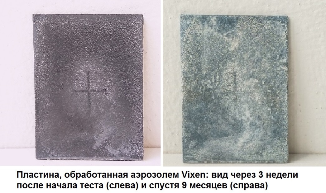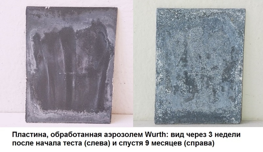 Итог первого этапа тестирования таков: из пяти испытанных видов защитных покрытий только два смогли достойно выдержать двухнедельное пребывание в агрессивном растворе. Это образцы металла, обработанные российским составом Vixen (он занял 1-е место), а также немецким спреем Wurth (2-е место). На контрольных пластинах, обработанных этими аэрозолями, не выявлено ни следов коррозии, ни отслоений цинкового грунта.