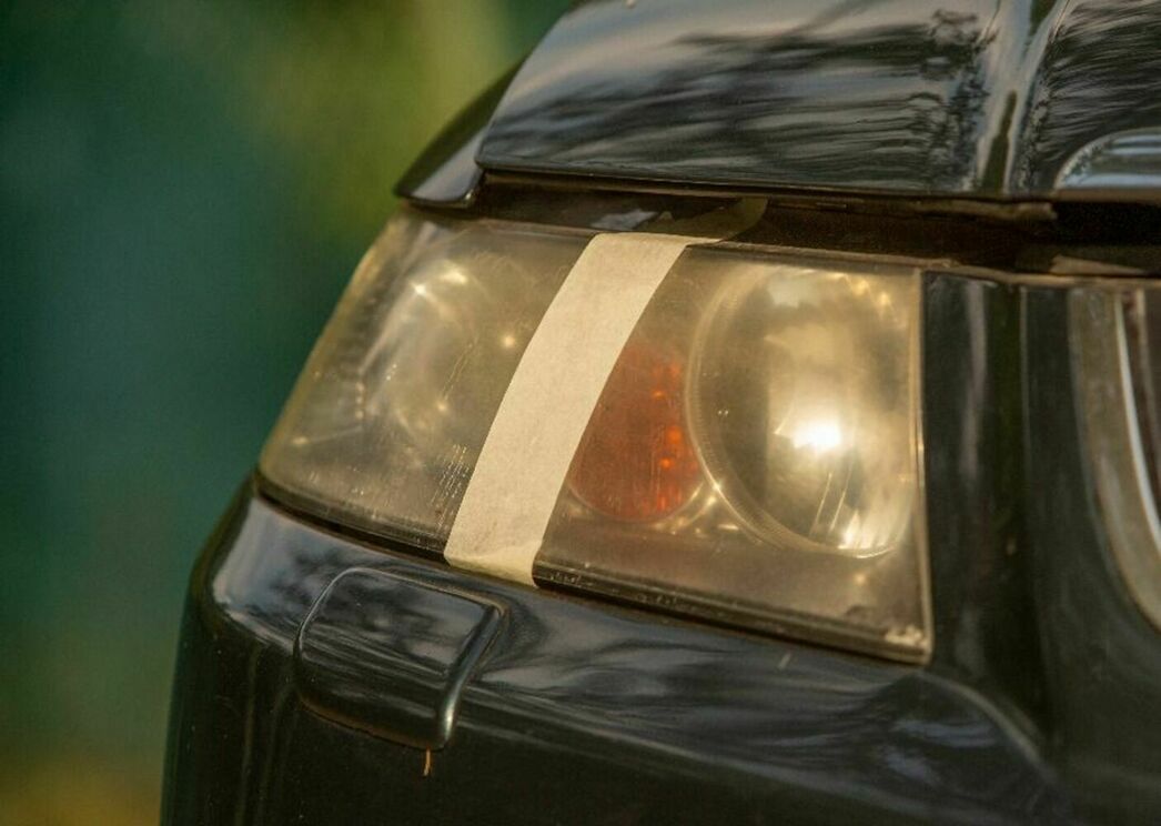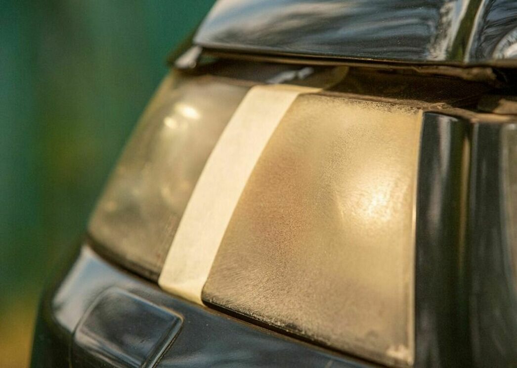 Помыв фары, наносим на них полироль тонким слоем и даем подсохнуть. Лето 2021 способствует сокращению времени на полное высыхание, поэтому приступать к обработке можно уже через 3—5 минут. Круговыми движениями шаг за шагом проходим периметр. Эффект видно уже после первого нанесения, однако для закрепления пройдем дважды. Чтобы результат нашего эксперимента был более читаемым, мы разделили фару надвое малярным скотчем и сначала обработали только правую сторону. Собственно, на фотографии все видно, а лишних слов не требуется: полироль легко справился с желтым мутным налетом и вернул оптике былую молодость.