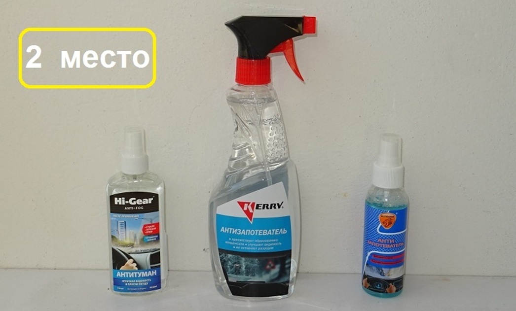 Cледующая группа антизапотевателей, занявшая второе место по итогам тестирования, включает сразу три продукта. Это спрей известного американского бренда Hi-Gear (выпущенный, правда, на российском предприятии), а также отечественные Kerry и Eltrans. Данные препараты на несколько единиц уступают лидерам по уровню «очистки» стекла. Относительное уменьшение уровня освещенности, вызванное оседанием влаги на его поверхностях, варьируется от 12 до14%.