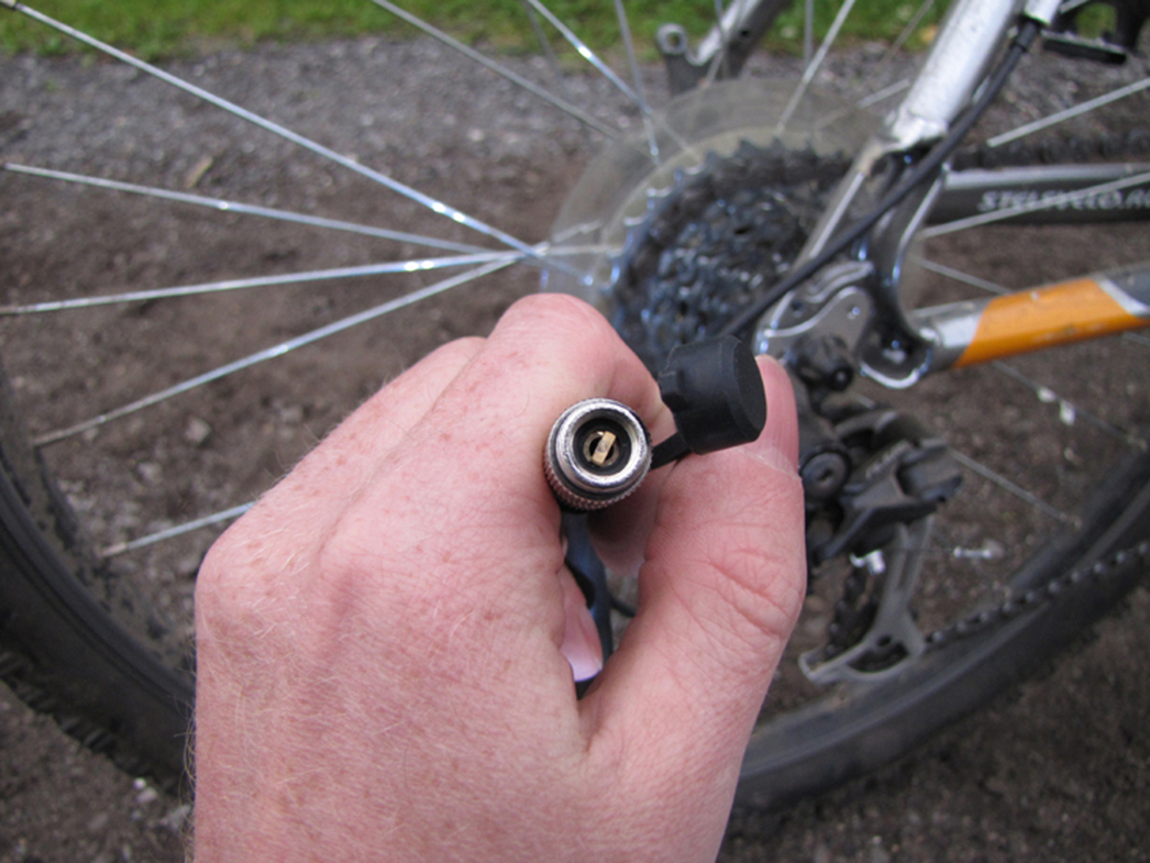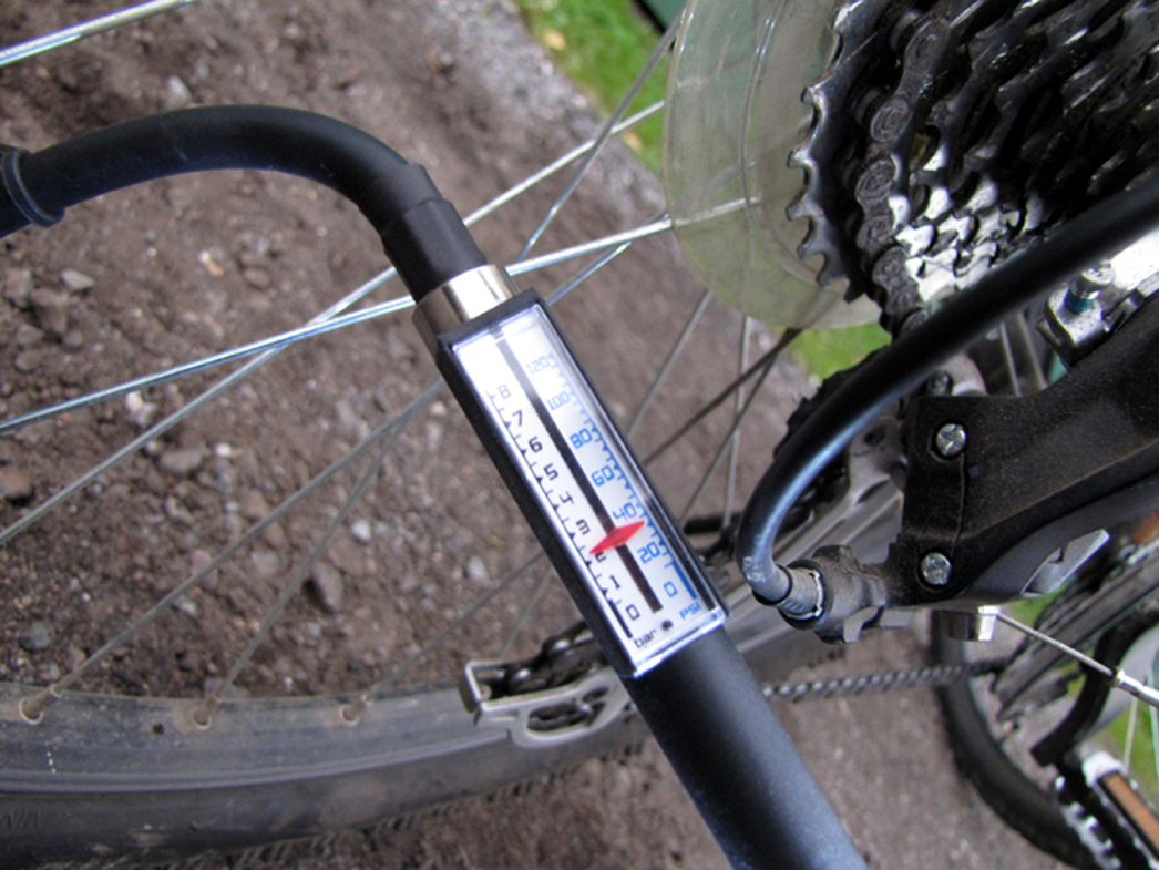 На шланге имеется механический манометр, благодаря которому вы можете не на ощупь определять степень накачки шин велосипеда, а что называется с помощью точного прибора. На конце шланга стоит фитинг под колесный клапан (в простонародье «сосок»). На самом деле фитинга там два, один накручен на другой: такая конструкция позволяет использовать компрессор для накачки шин с «сосками» разных стандартов.