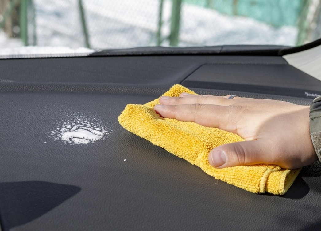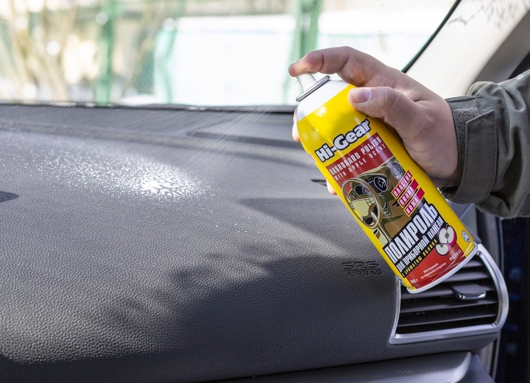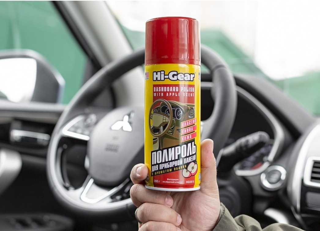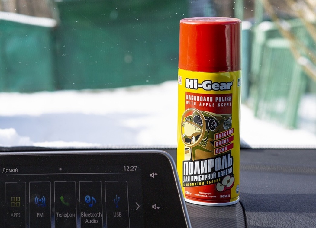Но лучше воспользоваться специальным средством — «Полиролем для торпедо» от Hi-Gear. Этот универсальный препарат, созданный специально для пластиковых элементов, поможет в восстановлении пластмасс как внутренней, так и внешней отделки. Полироль для приборной панели обладает антистатическим эффектом — пыль не будет скапливаться. Придает приятный глянцевый блеск и позволяет надолго забыть о жирных отпечатках пальцев. Поэтому сенсорный экран магнитолы тоже попадает в ареал его применения.