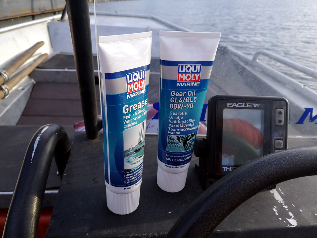 Если открыть кожух подвесного мотора, то под ним мы увидим механизм ручного стартера и всякие приводные детальки от румпеля. И эти механизмы так же нуждаются в смазке. И не абы какой, а специальной, предназначенной именно для водной техники. В ассортименте компании Liqui Moly есть спецсостав Marine Grease.