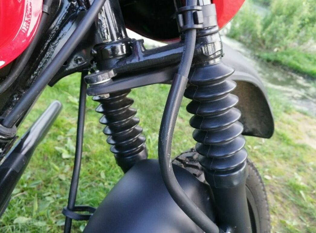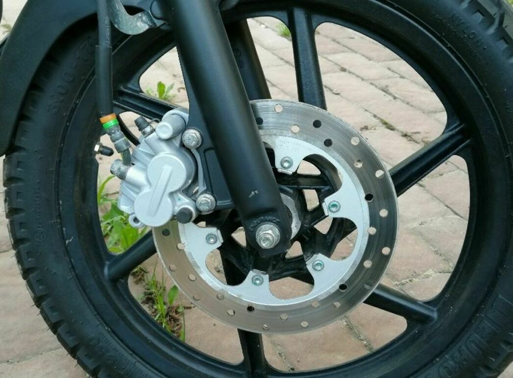 Передняя подвеска оснащена телескопической вилкой с увеличенным ходом, «перья» спрятаны в резиновые кожухи, что предотвращает попадание грязи и пыли на штоки. Подвеска отрабатывает прекрасно, даже при попадании колеса на скорости в яму, руль из рук не вышибает и мотоцикл сохраняет устойчивость.