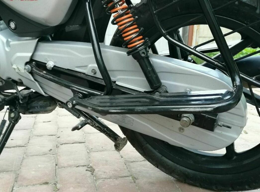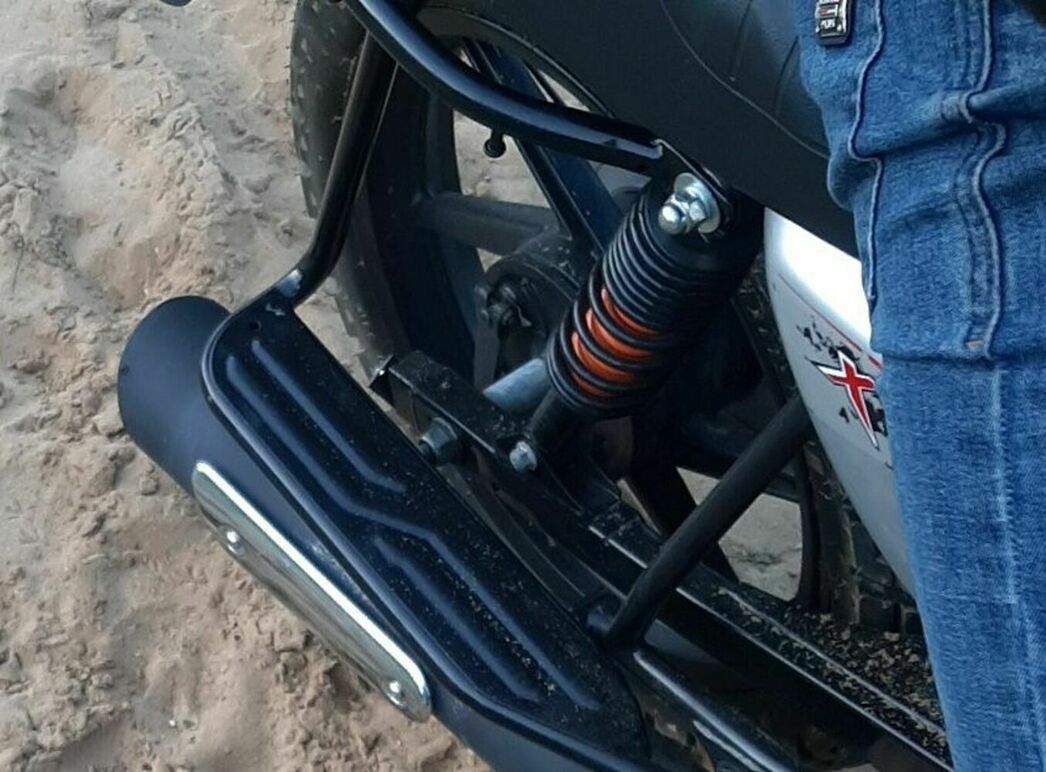 Во-вторых, в стоковой версии Boxer 150 уже есть небольшие дуги безопасности, которые защищают ноги «райдера» при маневрировании между деревьев на пересеченной местности или в случае падения вместе с мотоциклом на бок. Безопасности пассажира конструкторы Bajaj так же уделили самое пристальное внимание. Подножки для ног пассажира здесь представляют из себя не хлипкие складные кронштейны, а полноценные площадки из прочных металлических труб. Чтобы шнурки от обуви или штанина того, кто сидит позади, не попали под приводную цепь, она спрятана в защитный кожух. Да и сама цепь в таком коробе пачкается меньше, а значит её обслуживание требуется не так уж и часто. На заднее колесо мотоцикла, установлен специальный защитный каркас, чтобы свисающие элементы одежды не намотались на него во время движения. В-третьих, индийский 150-«кубовый» мотоцикл оснащен полным комплектом светотехники, зеркалами и продается в России с ПТС. Иными словами он ставится на учет в ГИБДД и на нем совершенно легально можно ездить по дорогам общего пользования.