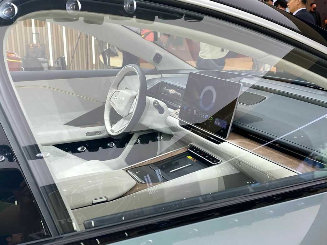 Длина флагманского электрокара превышает 5 м. Из-за покатой и, кстати, панорамной крыши, модель поначалу можно принять за лифтбэк. В список оснащения включен внушительный набор умных систем. Судя по лидару на крыше, стоит рассчитывать на автопилот как минимум второй ступени.