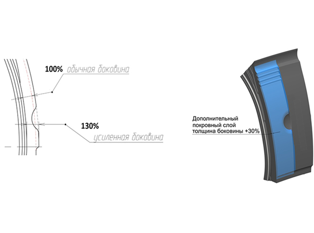 Усиленная боковина. Особенностью использования шин в городе являются частые соприкосновения боковой части шины с бордюрами при подъездах к остановкам, на парковках и т д. При соприкосновении боковины с бордюром происходит механическое повреждение защитного резинового слоя, что приводит к преждевременному выходу шины их строя. Для минимизации вероятности выхода шины по истиранию боковины в модели Cordiant Professional VC-1 применена технология Reinforced Side Guard, которая заключается в увеличении резинового слоя боковины на ~30%. Этот защитный слой принимает на себя все механические повреждения в процессе эксплуатации. Помимо этого на боковине применены 4 индикатора износа, которые позволяют определять степень износа боковины.