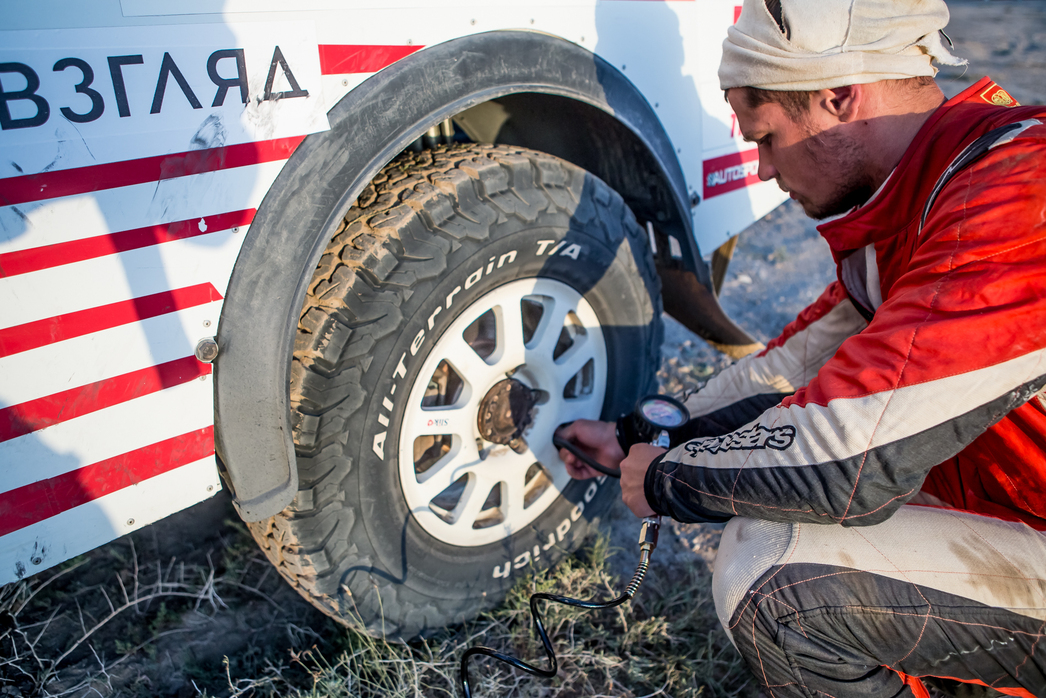 Кстати, и сами шины были не промах: BFGoodrich All Terrain. И пусть это не специальные спортивные покрышки, на которых ездят почти все команды. Но они позволяют многое: и лихо нестись по каменистым дорогам Гоби, и атаковать высоченные дюны пустынь Такламакана или Алашань. Крепкие, отлично гребут, на скоростных отрезках держат траекторию и, самое главное, на низком давлении при хорошем ходе не разрушаются! Ведь когда покрышка сильно мнется при качении, боковина нагревается так, что не дотронешься. Если резиновая смесь, каркас — так себе, от температуры покрышка разлетится на раз-два. Понятно, что даже с BFGoodrich не нужно нестись сломя голову, мести хвостом на каменистых участках, идти в глубоком заносе. Порезать шину ничего не стоит. Но это в полной мере относится и к спортивным шинам.
