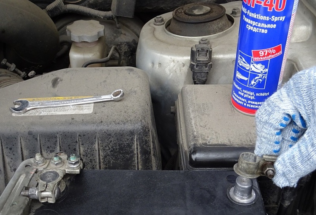 Применительно к аккумуляторным проводам этот состав подходит как нельзя лучше — он отлично вытесняет воду из самых труднодоступных мест стыковочных наконечников, устраняет грязь, следы масла и густой смазки, улучшая тем самым электрическую проводимость на контактах. Препарат можно с успехом использовать как для чистки наконечников, так и клемм аккумулятора.