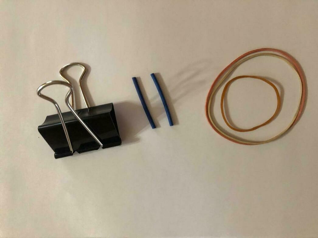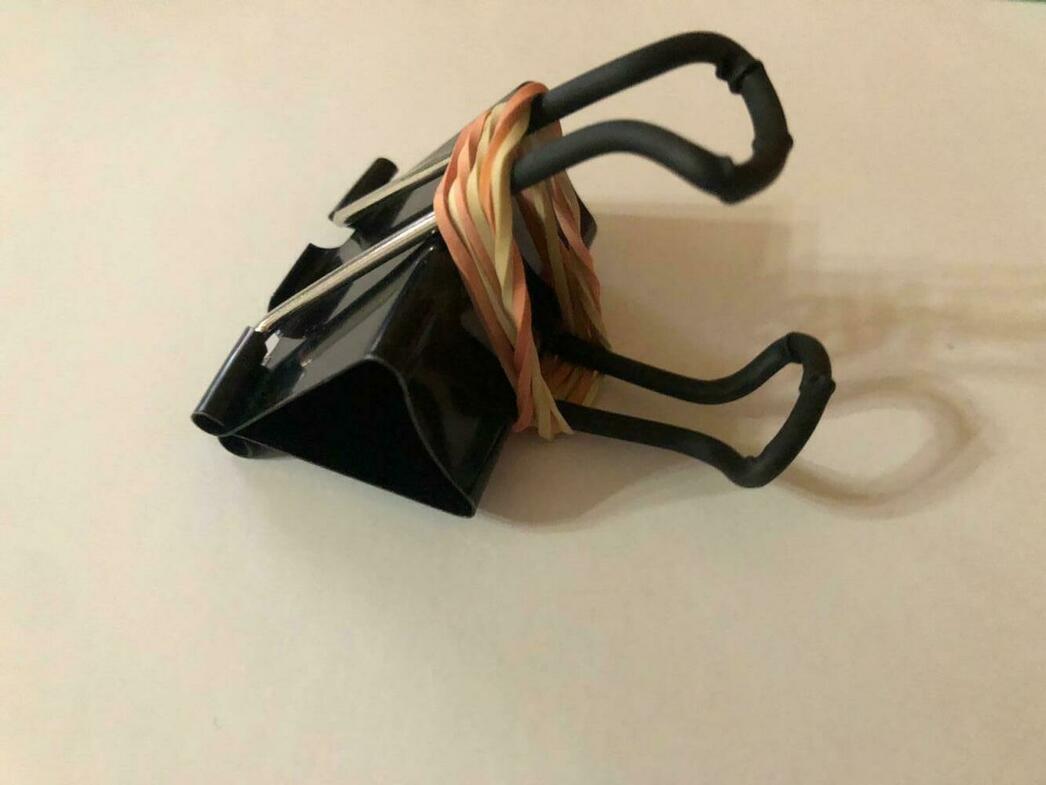 Сначала с клипсы нужно снять оба «уха» и немного загнуть с той стороны, где петля. После чего их желательно обмотать плотной нитью, чтобы потом, когда зажим превратится в держатель, металлические рейки не поцарапали телефон. Вместо ниток вполне можно использовать термоусадочную трубку. Затем возвращаем скобки на место и фиксируем несколькими резинками.