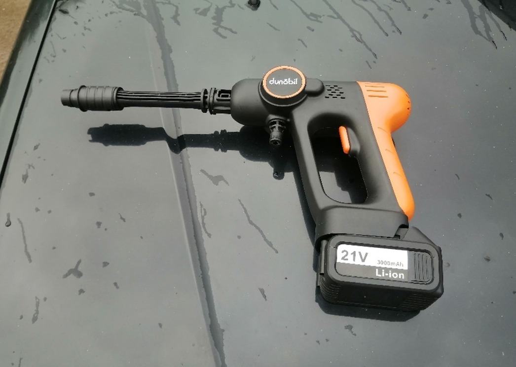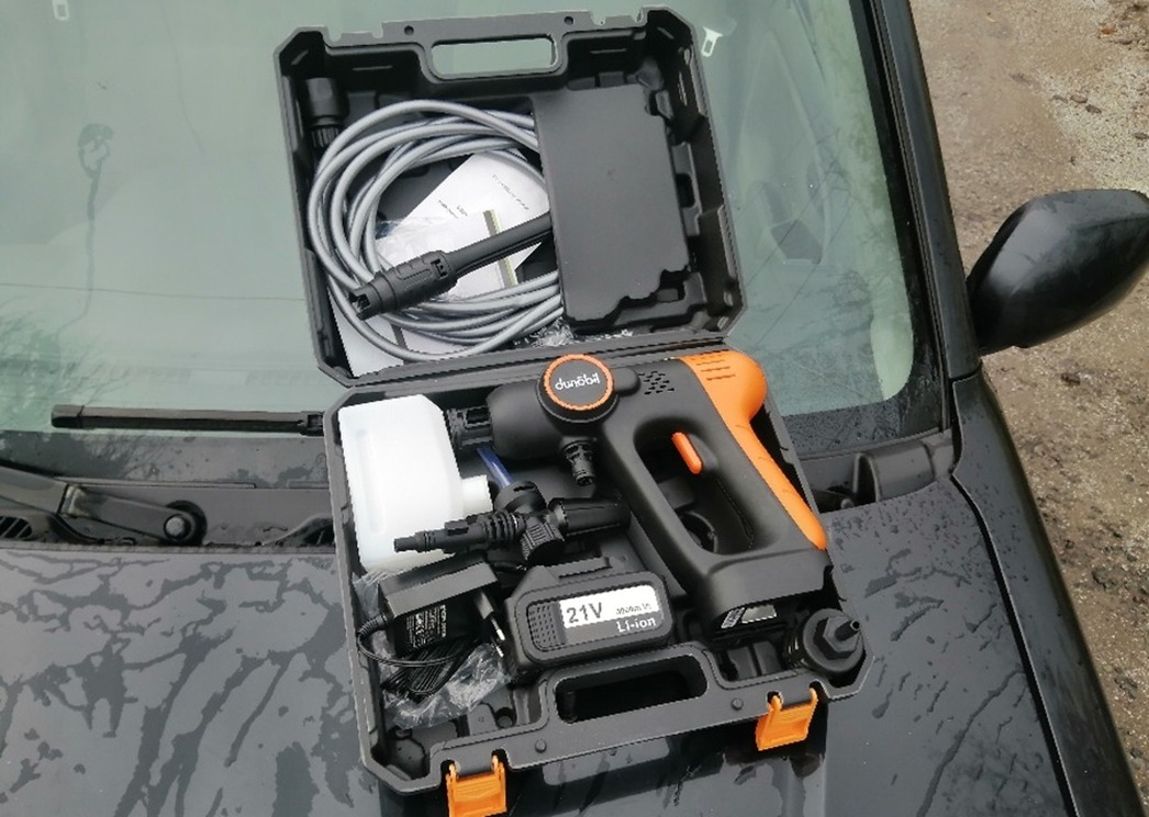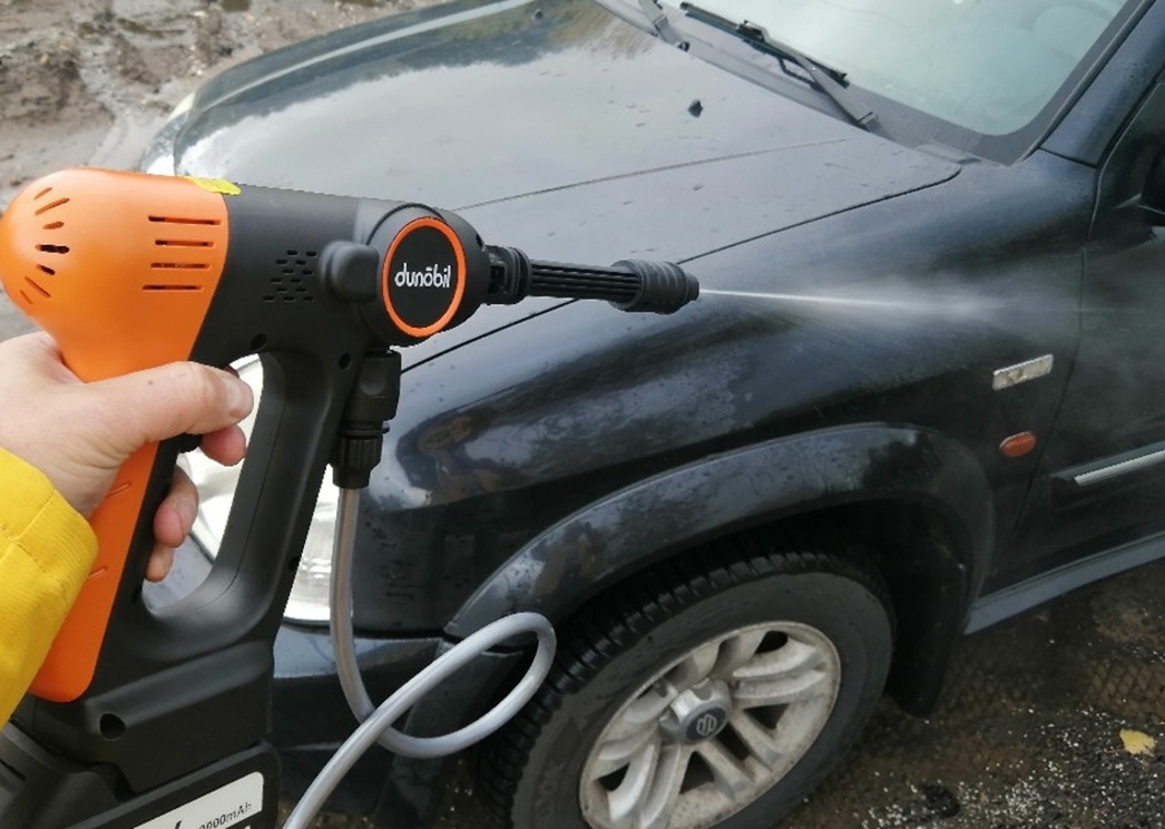 Что общего у мойки высокого давления и бытового шуруповерта? Например, компоновка. У мойки Dunobil Washer Basic, тестирование которой мне было поручено осуществить, она точно такая же, как и у «шурика» — «пистолетная», назовем ее так. Она не требует постоянного подключения к электросети, поскольку питается от аккумулятора в ручке девайса. Вес — что-то около пары килограммов. Можно ходить и «стрелять» струей воды куда в голову взбредет. Практически мечта моего босоногого детства.