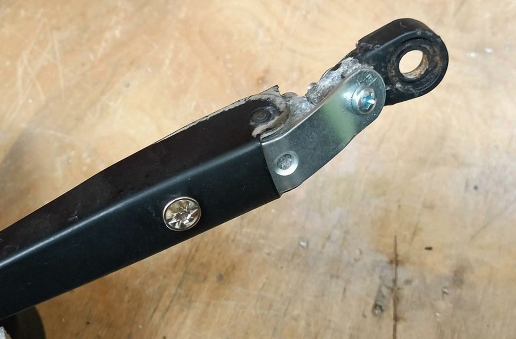 В итоге, после поиска по гаражным «сусекам», для стяжки с наружной стороны коллеге удалось подобрать завалявшуюся пластину-проушину от мебельного крепежа. Она идеально подошла по своим размерам и прочностным параметрам к поломанному рычагу. Дополнительную прочность наружному соединению обеспечили два болта М4 с гайками.