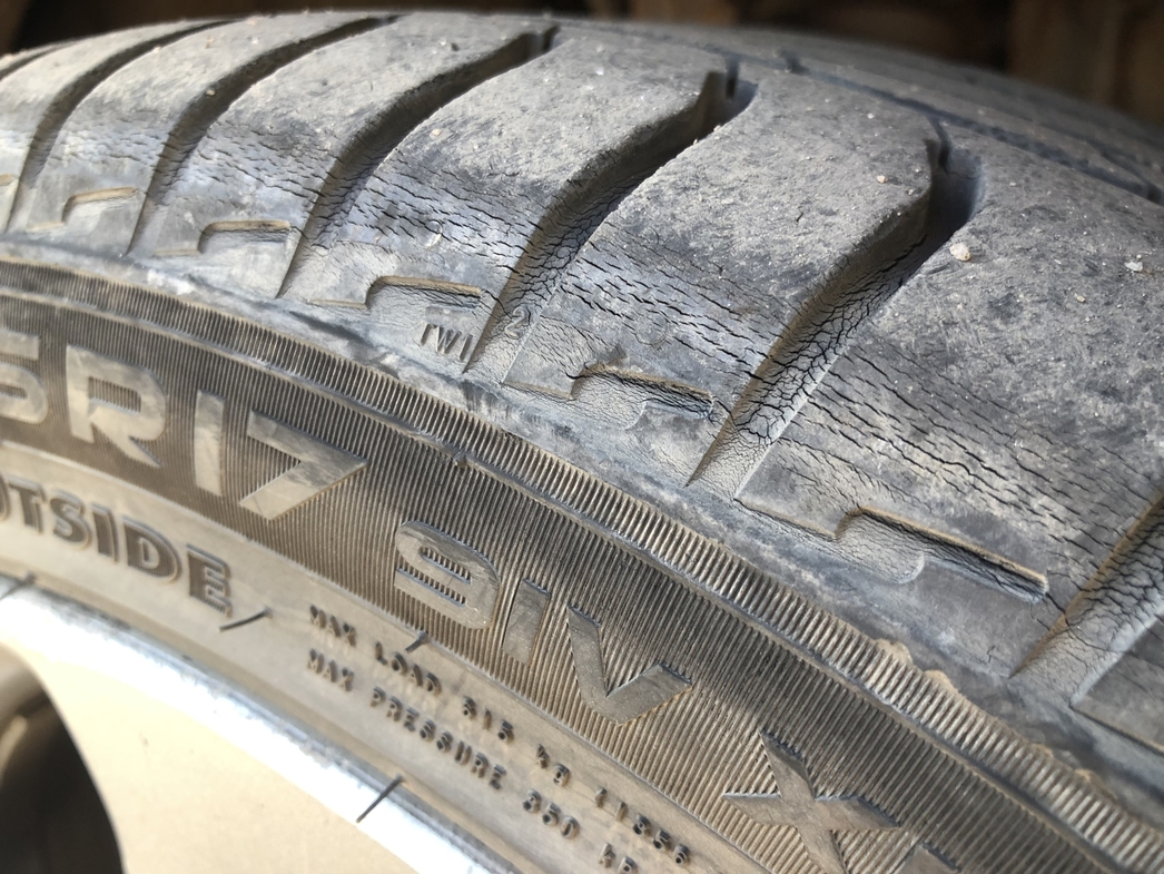 Итак, новенькие шины, изготовленные в июле 2015 года, были установлены на автомобиль в марте 2016. До этого они хранились в темном неотапливаемом гараже согласно требованиям завода: вертикально, на стеллаже. Далее их надели на диски, с которых никогда не снимали — на исследуемом автомобиле два комплекта колес в сборе. Для полноты картины надо сказать, что несколько раз резину перебортировали: меняли изношенные вентили, лечили пропускание между диском и шиной. Порезов, проколов, грыж и прочего нет и по сей день.