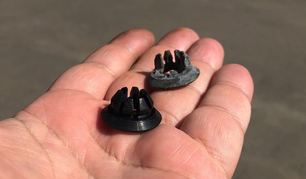 Что ж, даже японский пластик иногда иссыхает от высоких подкапотных температур. Цена вопроса двух деталей — 328 рублей: 158 за втулочку, 170 — за фиксатор упора. Это — стоимость «оригиналов»: аналог, возможно, будет дешевле. Но крохоборничать на копейках уж не будем, да и штатная запчасть прослужила без малого 19 лет — почет и уважение. Замена — от пяти до семи минут, разве что капот приходится плечом держать. Неудобно.