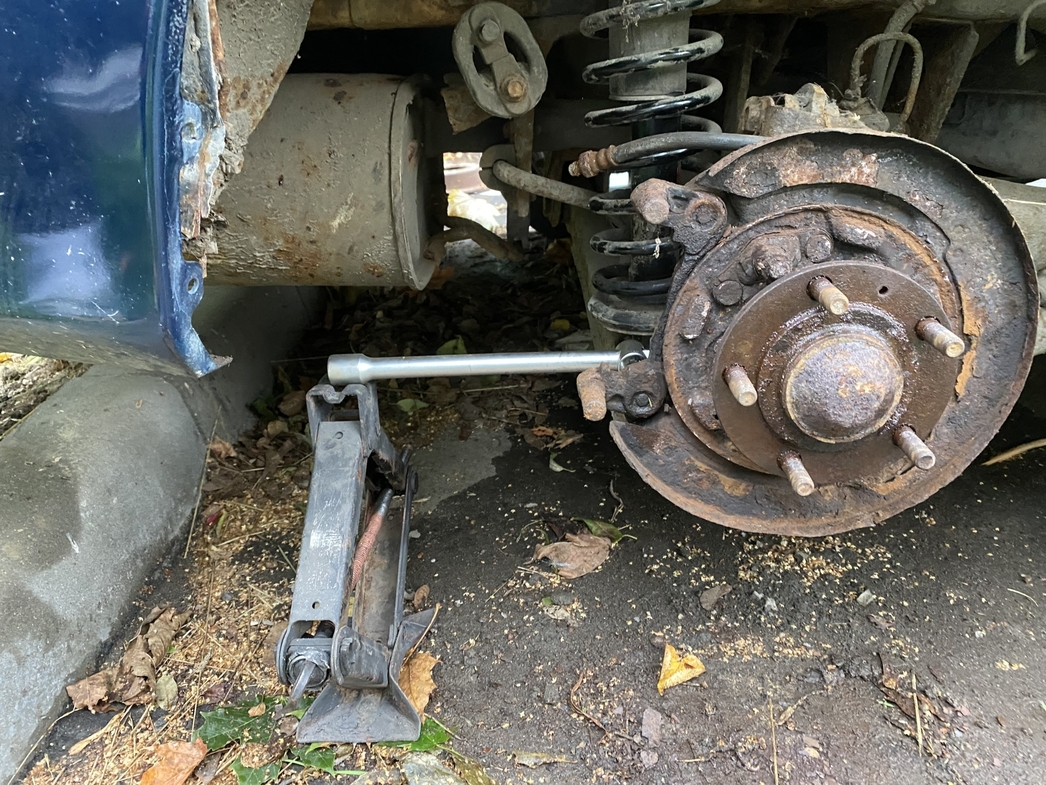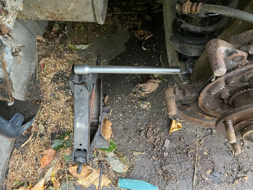 Тут-то и поможет дополнительный домкрат. Самый простой, штатный, винтовой. Если рукой болт не открутить, а трубу для увеличения рычага не просунуть, то всегда можно использовать обычный ключ, а тяговую силу искать не в мышцах, а в винтовом механизме домкрата. Он двухтонную машину поднимает — провернет и прикипевшую гайку.