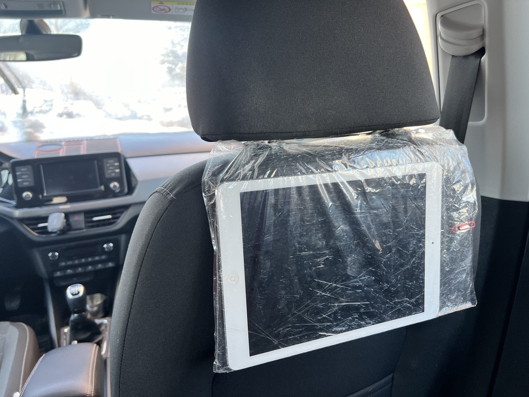 Первым делом стоит озаботиться прозрачным «файлом» — целлофановой папкой-вкладышем с дырками, созданном для хранения документов в папках «корона». В любом канцелярском магазине его продадут за десять рублей. Далее следует снять подголовник переднего кресла — стоящего непосредственно перед детским — и аккуратно вставить «файл», закрепив его ножками того самого подголовника. Держится крепко!