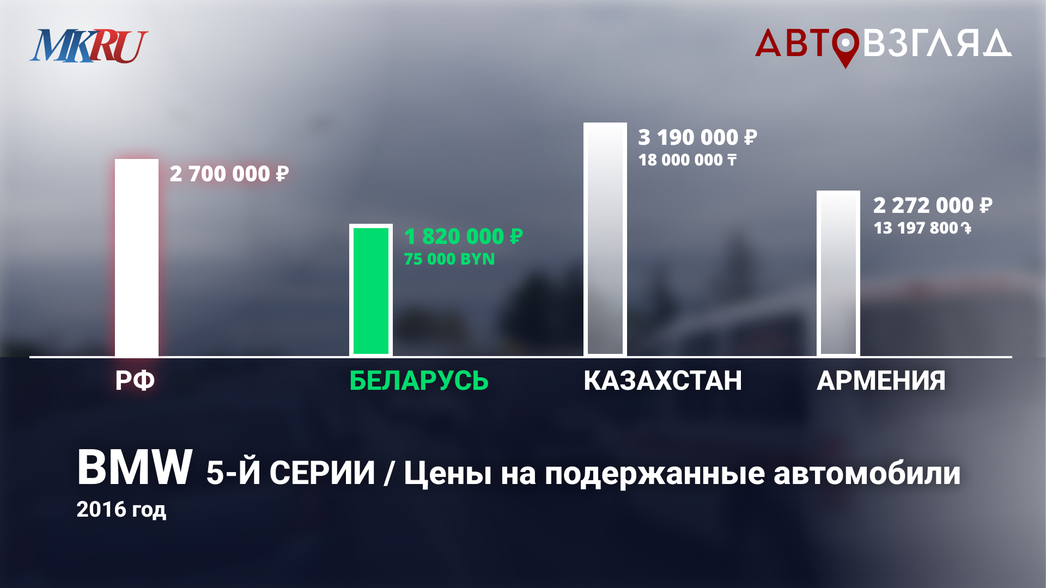 Куда более ощутима разница в премиальном сегменте. Скажем, шестилетний BMW 5-й серии в нашей Необъятной обойдется примерно в 2,7 млн целковых, в Казахстане — в 3,2 млн, в Армении — в 2,3 млн. Что же до республики Беларусь, то там вполне можно отыскать неплохой вариант за 1,8 млн. Но почему же у наших соседей-друзей столь сравнительно низкие цены?